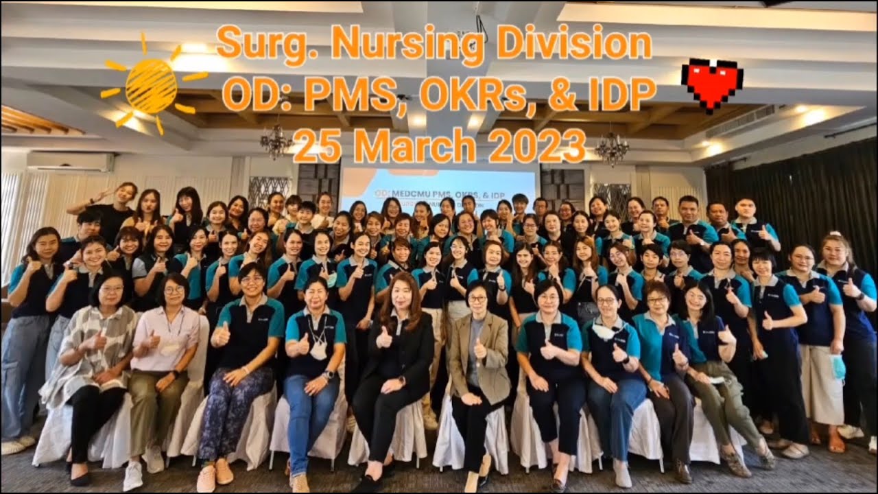 งานการพยาบาลผู้ป่วยศัลยศาสตร์ ฝ่ายการพยาบาล โรงพยาบาลมหาราชนครเชียงใหม่ ได้จัดทำ โครงการสัมมนาเพื่อการพัฒนาองค์กร (OD) งานการพยาบาลผู้ป่วยศัลยศาสตร์ ภายใต้หัวข้อ “ MEDCMU PMS OKRs & IDP ” ณ ห้อง The glory โรงแรม North Hill City Resort เชียงใหม่ ซึ่งมีผู้เข้าร่วมสัมมนาประกอบด้วยบุคลากรจำนวนทั้งหมด 6 รุ่น โดยได้จัดโครงการสัมมนาขึ้นสำหรับรุ่นที่ 1 ในวันที่ 25 กุมภาพันธ์ 2566 และดำเนินการไปจนถึงรุ่นที่ 6 ในวันที่ 1 เมษายน 2566 ที่ผ่านมา